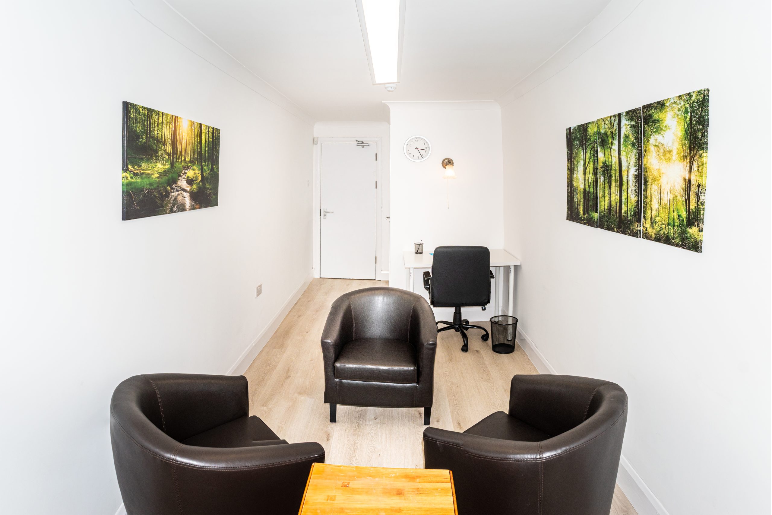 A quiet, modern room with three leather chairs, a side cabinet, and a desk, ideal for private sessions, assessments, or consultations in a calm and professional setting.